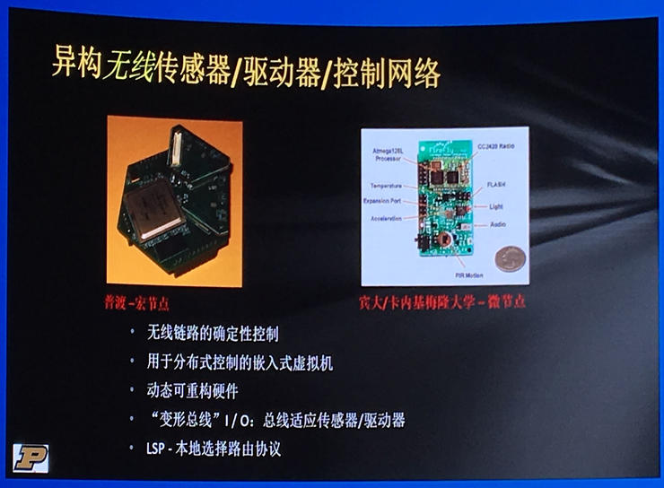 高性能的节点产出了宏节点和微节点,具有重新编程的功能,而且是自适应的软件,我们利用总线当中的架构帮助这些系统。例如无人机和机器人要能够适应改变的环境,而为了使得软件工程师的工作更简单,可以设计一些能够适应变化的环境的系统。这些元素怎么和刚才我们提到的网络相连接?我们的网络当中并不只有计算节点,还有传感节点、思考节点和驱动节点,例如精准无人机是物理世界和网络世界之间连接的桥梁,驱动器控制网络和传感器相连,驱动现实世界中的智慧家庭,驱动实际的医疗机器人系统。这就涉及到物联网的技术了,所以和传统上讲的无线传感网络还是有些不同的。