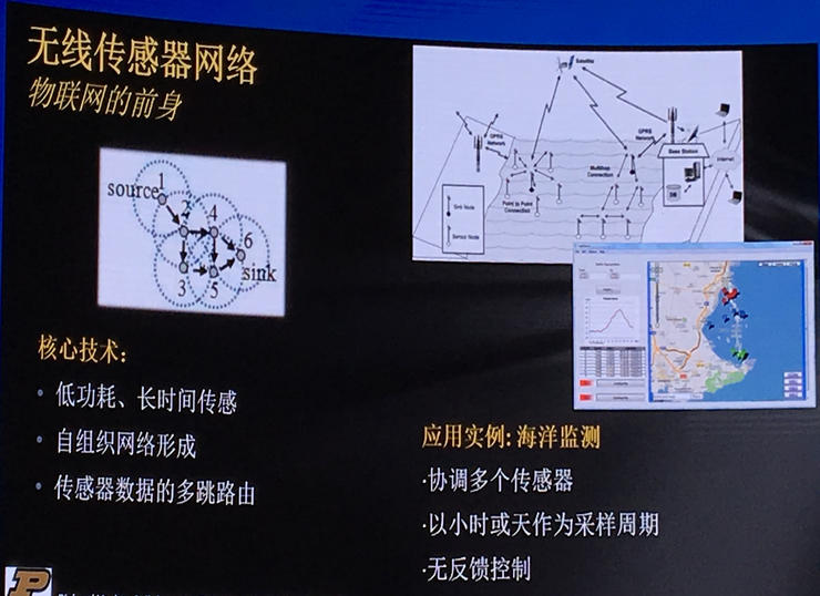无线传感网络其实是物联网的前身,关注的是核心技术和低功、耗长时间的传感。八九十年代主要是关注低功耗,以及如何从一个临时网络中输入信息,也就是早期“云”的概念。很多人关注自组织网络的形成和传感器数据的多跳路由。现在无线传感网络已有诸多应用实例,例如在海洋监测中的应用,我们协调了多个传感器,有对盐度监测的传感器,有对水活动监测的传感器,以小时或天作为采样周期,但是这个系统没有反馈环节,现在该系统已经被用于气候变化的监测。