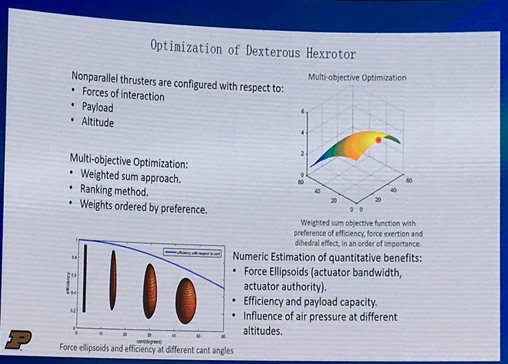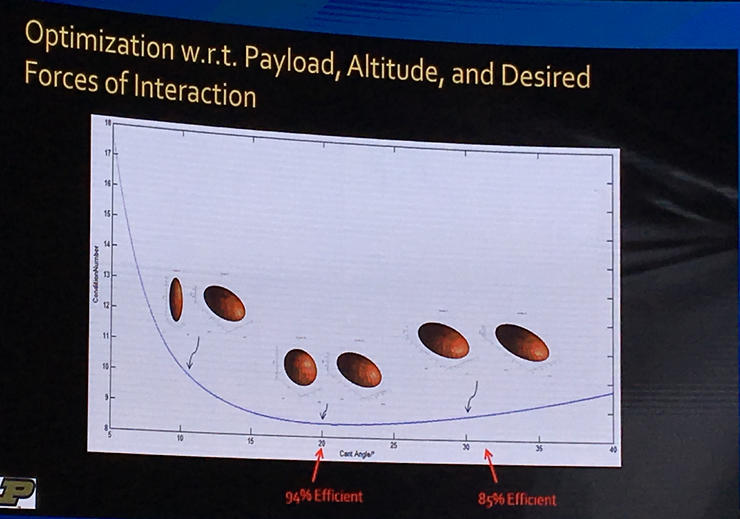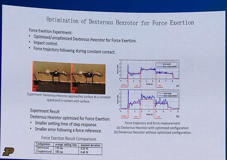 这是之前我们在无人机方面做的一些早期的工作,大家可以看到,由于可以转向不同的自由度,同样也可以在不同的方向施加力。因为和周围环境的精准互动是非常重要的,也就是将虚拟世界的信息转化为实际的行动,这些旋翼通过在空中使用,其精准度肯定不如地面上那么精准。蓝色曲线是理想的曲线,用来衡量扭矩,需要考虑力量的大小和高度,红色曲线是具体使用的效率。