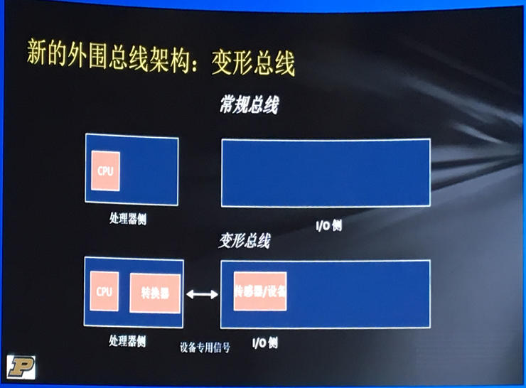 我们开发的另外一个伴生的产品叫做变形总线,主要是为了适应各种传感器和驱动器。我们把变形总线作为一个标准产品推出,和常规总线不同,常规总线收集传感数据时候是这样一个流程:首先希望传感器和CPU相沟通,然后把其它的内容放进去,利用总线的沟通实现传感功能。这种常规总线结构当中,我们希望传感器能够对信息进行一些转换,也希望CPU能够做一些思考,所以在变形总线当中我们的转型器会在整个总线当中移动,利用这些基于设备的信号更加有效地对传感器进行变形。其中,总线的拓扑结构并不是完全崭新的,但是却是一个多极并联的总线结构。