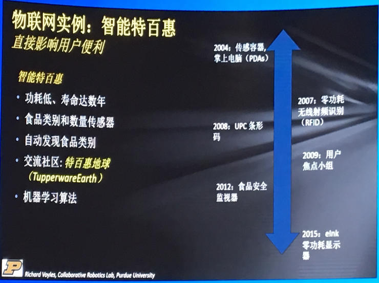 在智慧家庭概念中,要考虑的不仅仅是评估环境,还有对环境产生的影响。我们经常谈到的应用领域叫作网络物理系统,例如我们在实验室花数年时间做的“智能特百惠”。这是我们与特百惠公司合作打造的智能厨房,实际上可以把这个厨房看作智能机器人。它主要通过传感网络实现低功耗、长生命周期,以及食品类别和数量的传感。我们做的不是全部人类的活动,而是将重点放在厨房中食品的准备上。