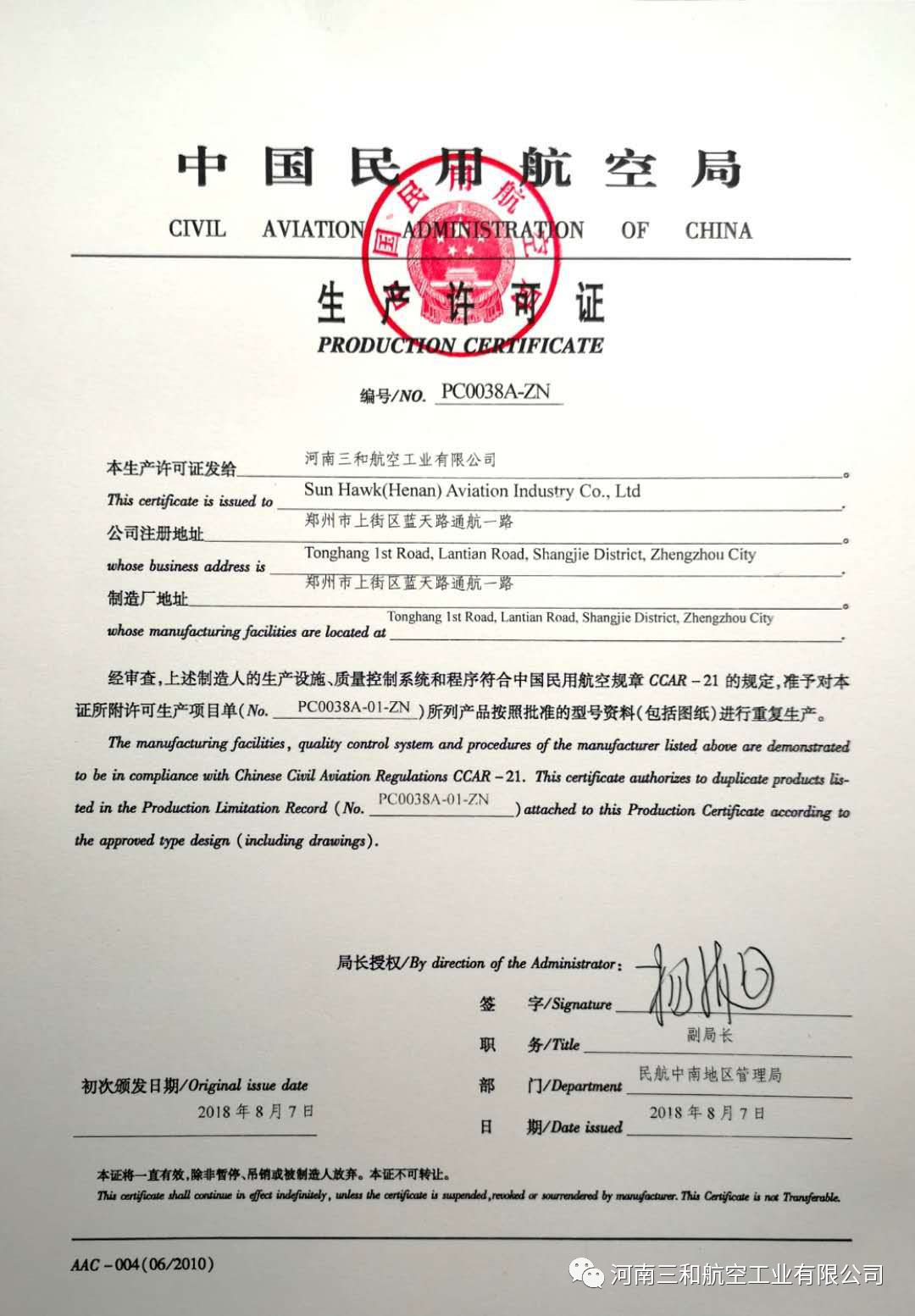 2018年8月7日,我公司自主研发的国内首款自转旋翼机“太阳之鹰”取得了由中国民用航空局颁发的生产许可证(PC),编号:PC0038A-ZN。这标志着我国首家自主研发的自转旋翼机可批量生产的生产线正式建立,成为了国内通航产业发展的重要里程碑。