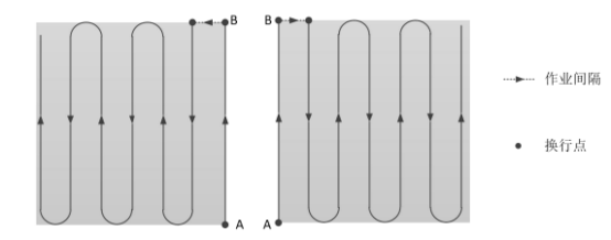 在 AB 点作业模式下,飞行器在记录 A、B 点后,可自动进行作业。飞行器飞行时将自动喷洒药液,换行时不喷洒药液。