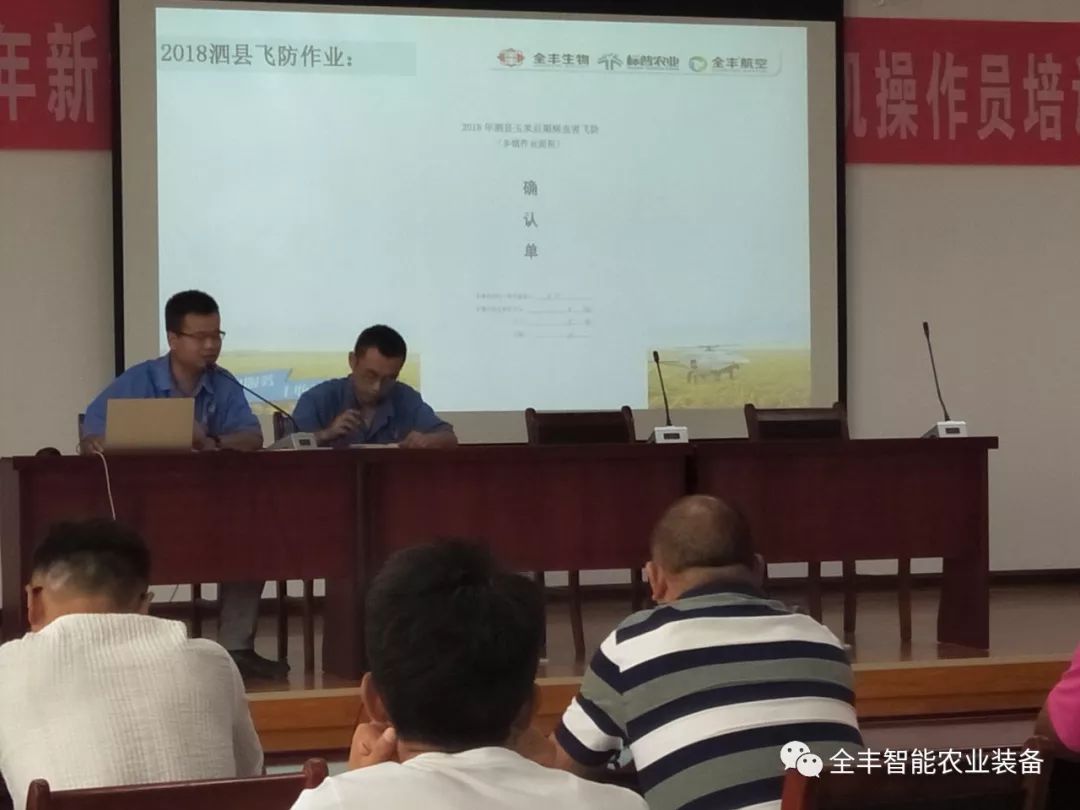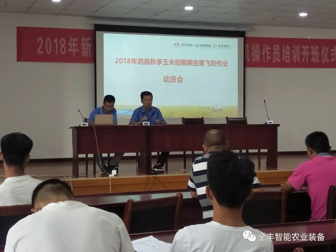 2018年8月19日,安徽全丰航空召集11个标普飞防大队队长、23个标普飞防分队队长、泗县农机合作社以及泗县植保站领导等60余人,召开2018年泗县40万亩玉米病虫害飞防作业动员会。