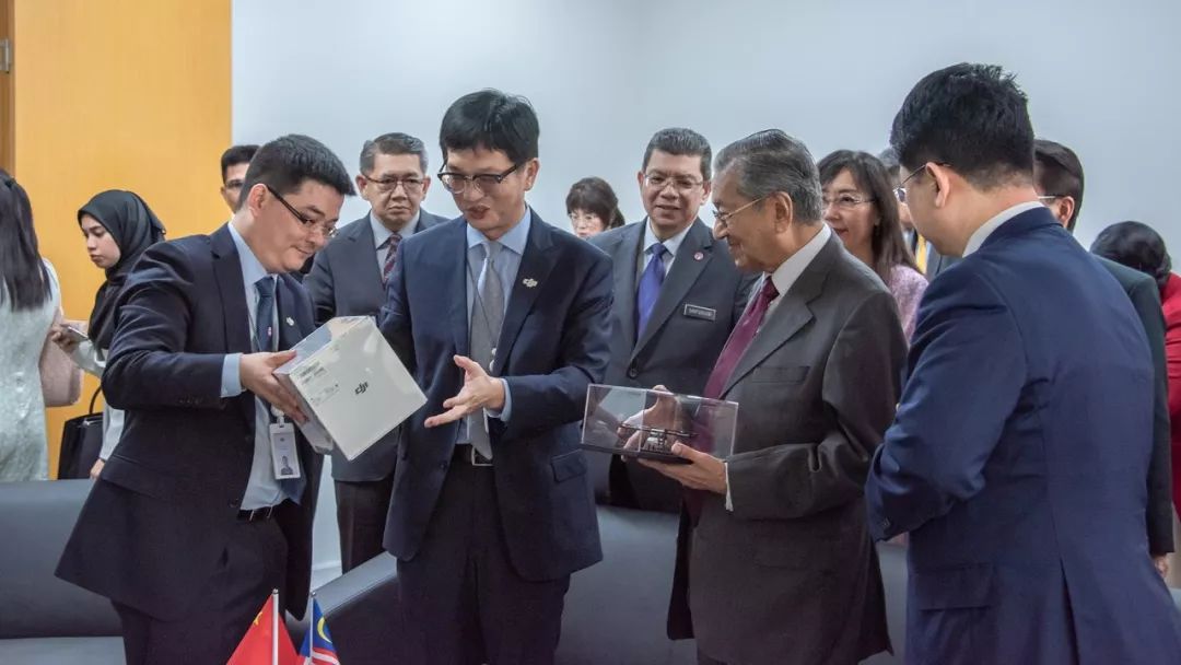 访问最后,大疆向马哈蒂尔赠送了大疆“御”Mavic Air无人机与农业植保无人机模型。