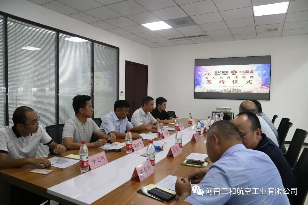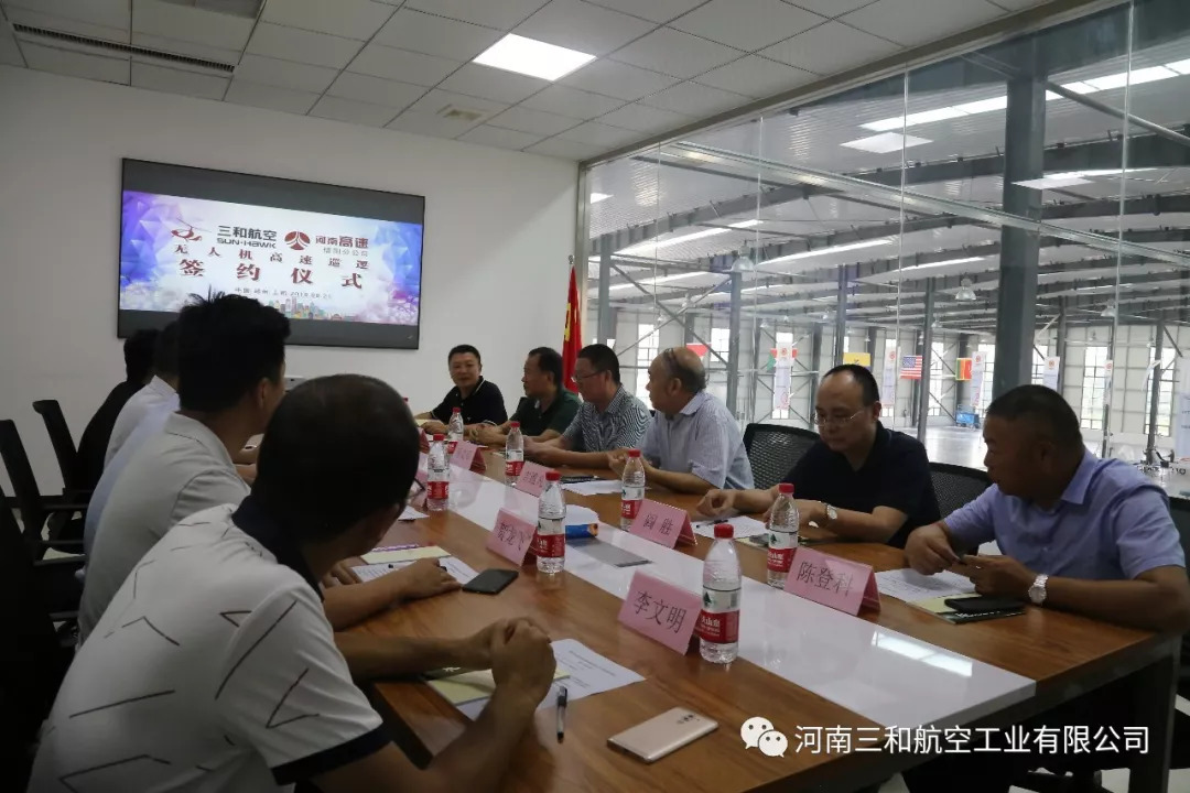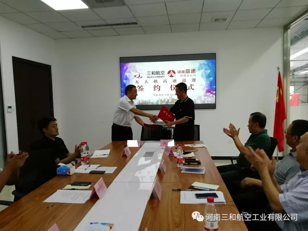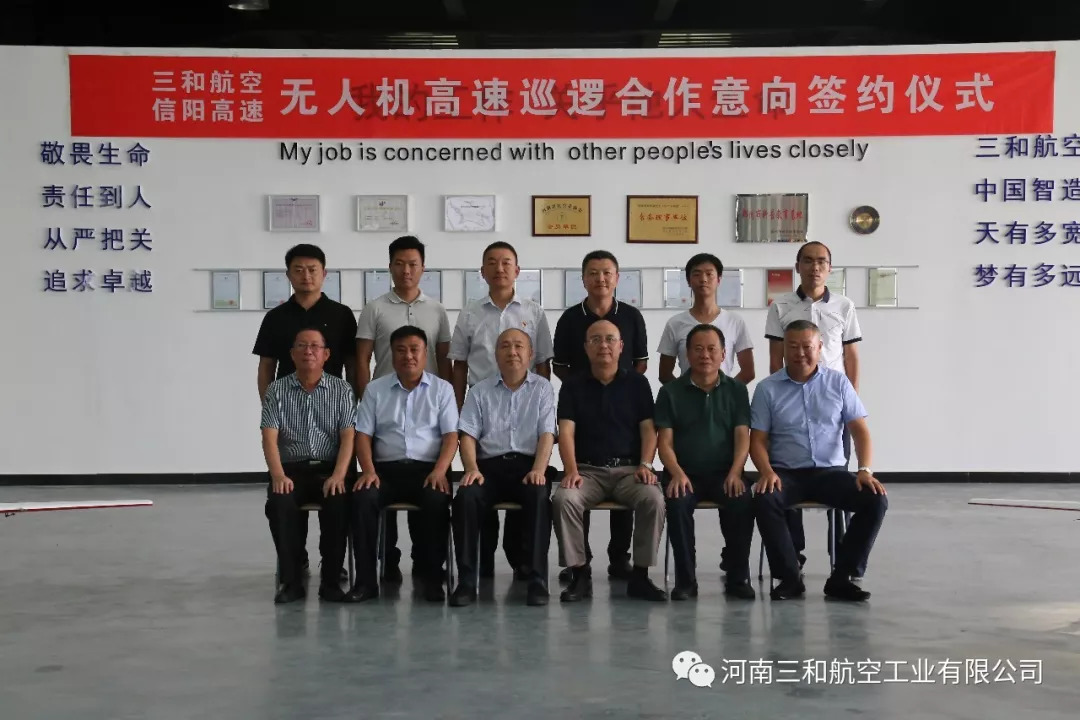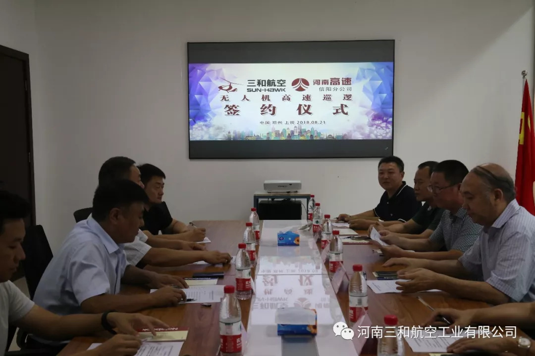 2018年8月21日,河南三和航空工业有限公司和河南高速公路发展有限责任公司信阳分公司达成高速巡逻战略合作意向,签约仪式在我公司举行并取得圆满成功,出席签约仪式的嘉宾分别是河南航空业协会常务副会长吉维凡、河南航空业协会常务副秘书长汤文军、郑州市上街区副区长阎胜、郑州通航试验区管委会副主任孙喜忠。