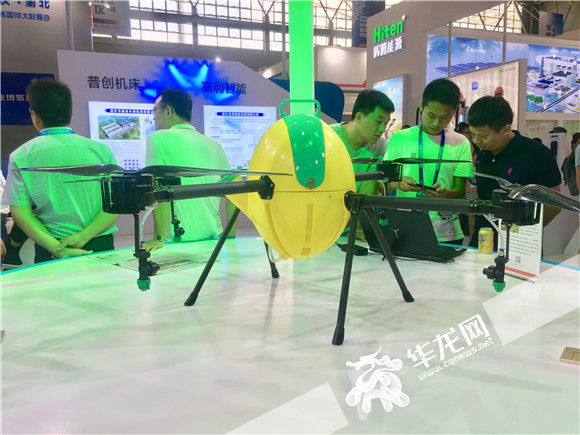 记者在智博会潼南展厅看到,有一个黄色“大肚子”,形似柠檬的“潼檬”农业无人机格外显眼。