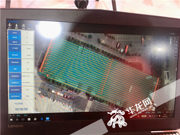 “潼檬”无人机控制系统,红色横线为无人机航线。见习记者 王庆炼 摄