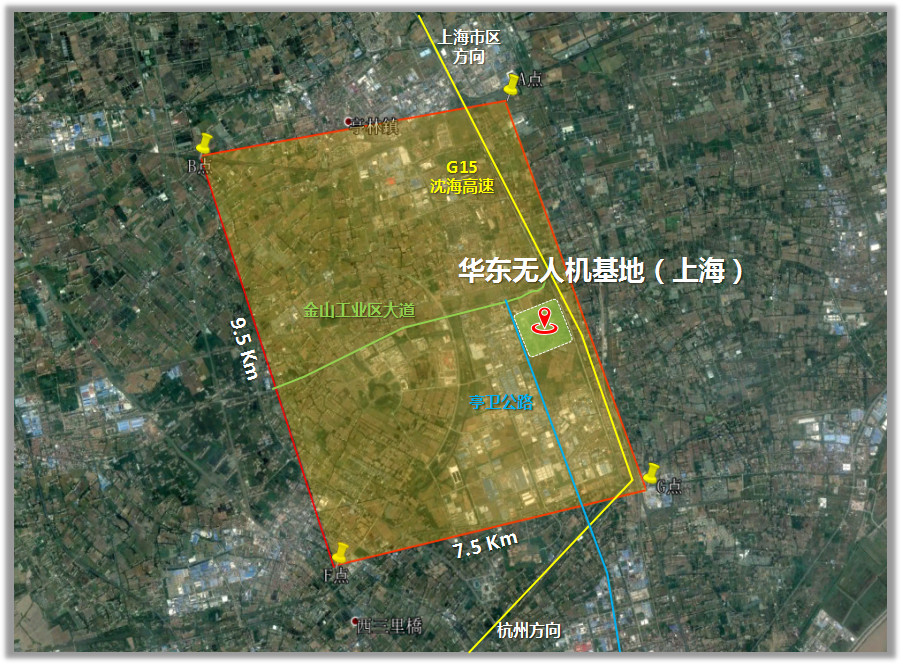 该无人机基地当前获批的空域位于金山工业区范围内:南北纵深约9.5 Km、东西宽度约7.5 Km、范围面积约58 平方公里;下一步适合水上无人机及大型无人机运行的空域也正在规划中。金山工业区成立于2003年9月,是上海市市级工业区,上海市品牌园区、上海市知识产权试点园区,目前正在打造国家绿色园区。园区规划面积58平方公里,凭借环境优美、配套齐全、产业集群,园区已成为杭州湾北岸先进制造业基地战略部署的主战场与最前沿。