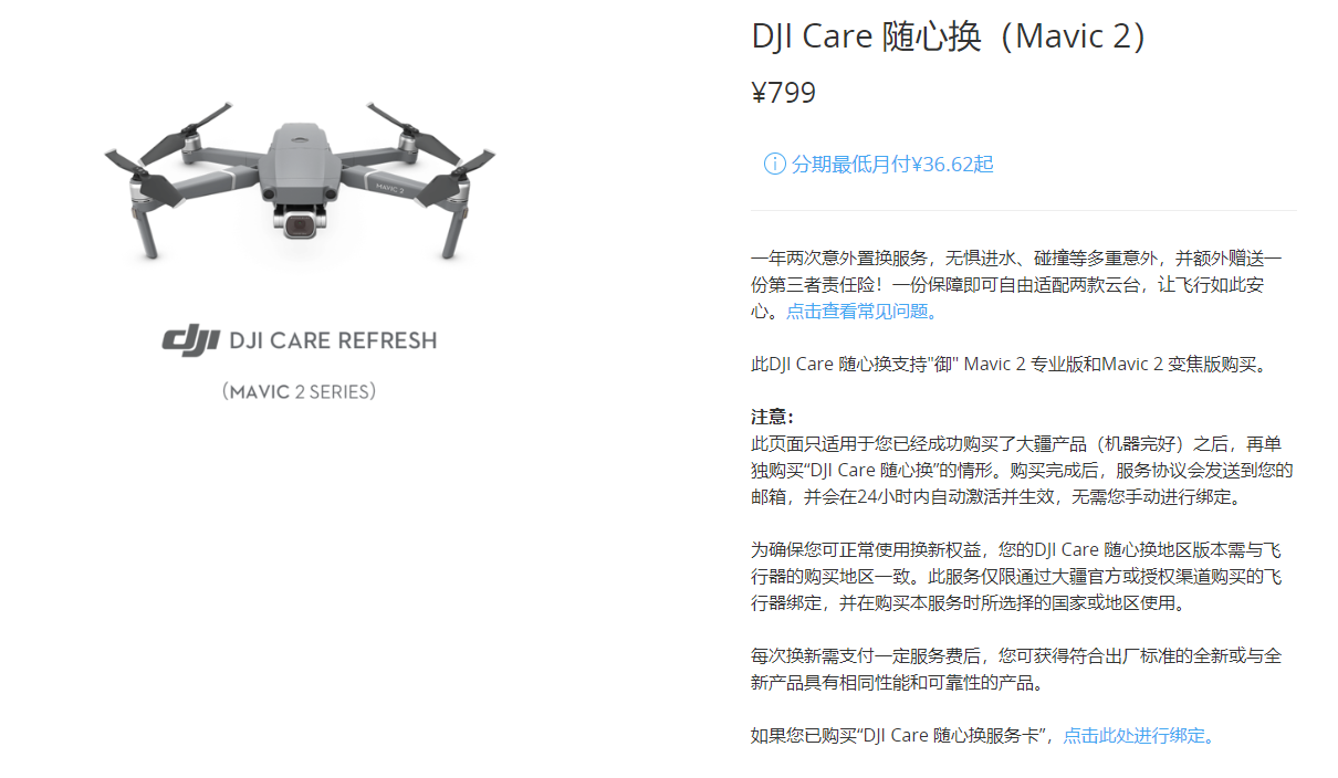不过,我们在大疆DJI官网上发现,Mavic 2的DJI CARE服务和其他的无人机有所不同。在页面中写出——两款机型可以随意更换云台。这也意味着,如果里买了变焦版不太满意画质,或者买了专业版需要变焦功能,你都可以找到大疆售后直接更换云台和一整套系统。