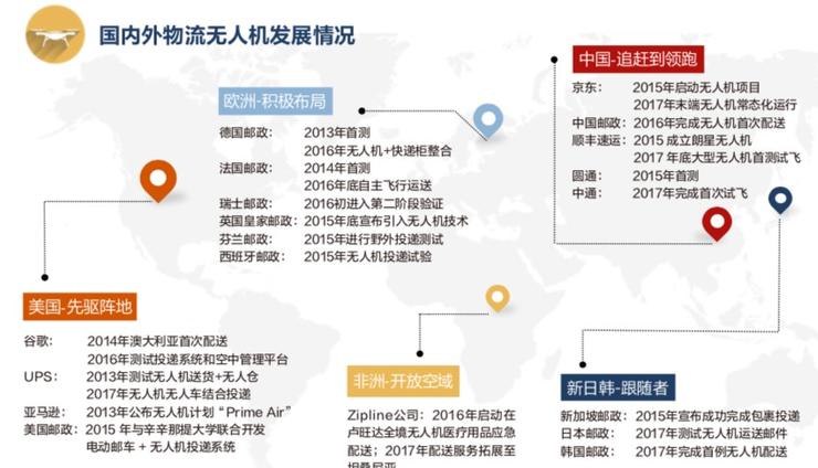 在国内,京东早在2015年启动了无人机项目,并以“干线级——支线级——末端级”三级智能物流体系作为发展方向,在2017年首先实现末端级无人机常态化运行。中国邮政、顺丰、圆通、中通也相继在16年、17年完成无人机测试及试飞,因此,2017年被称为物流无人机常态化运行的元年,今年将是物流无人机运行网络构建的关键一年。