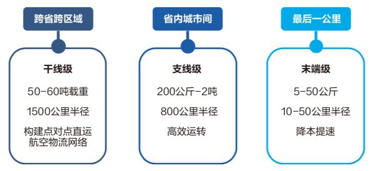 从配送距离及配送重量上,三级智能物流体系将物流无人机分为干线、支线和末端,分别针对跨省区域、省内城市间及最后一公里配送。而现在三级智能物流体系已经成为物流无人机的主流布局方向。报告中指出,未来三年内,末端级物流无人机产业化将加速进行,支线级物流无人机则成全球竞争焦点,这三年也成为政府与行业协同推进物流无人机产业发展的关键阶段。