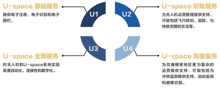 在世界范围内来看,美国宏观指导性政策频出,先后发布无人机系统设施图、启动无人机融合试点计划、成立高空工作组UAWG,无人机大规模商业化;欧盟将无人机安全融入欧洲空域,启动“无人机空域蓝图U-space”项目,旨在2019年前建立基础的U-space服务,整个项目服务包括基础服务、初始服务、全面服务和高级服务(具体如下图)。
