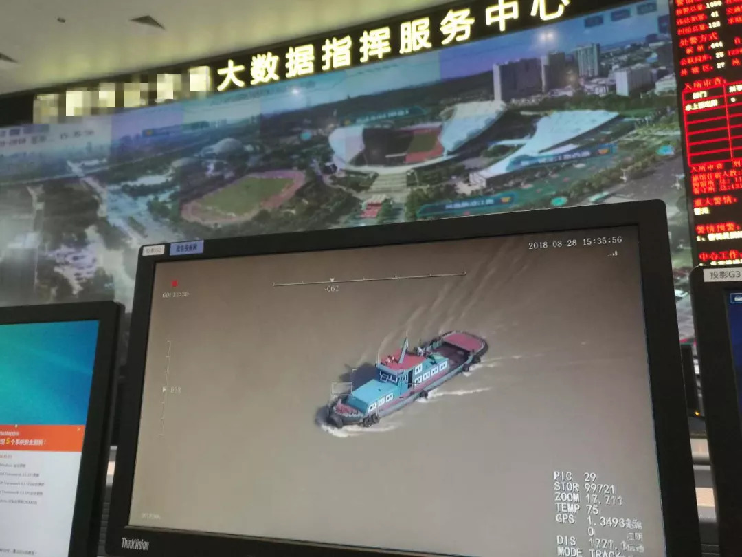 无人机从距离长江岸边5公里的指挥中心起飞,对长江20km江面进行巡查,工作人员通过3V搭载的30倍变焦光电吊舱对江面进行整体巡查,同时将采集到的影像实时传送到指挥中心大屏幕上,巡检人员足不出户即可对江面的整体情况了如指掌。