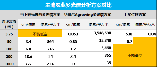 与目前主流的多光谱传感器方案对比,华科尔Agrowing方案能够同时适用高空和低空的光谱分析工作,用途广泛,实用性强。