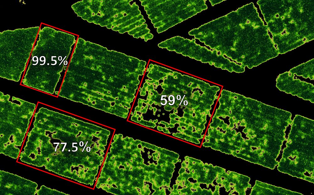 ▲高空探测示例:120米的高度计算菠萝冠层百分比