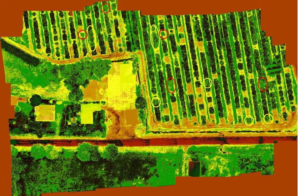 ▲高空探测示例:柑橘黄龙病检测,黄圈部分树木需要做检查,红圈部分树木最有可能被感染。