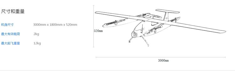 垂直起降固定翼无人机,最大起飞重量12kg最大有效载荷2kg,续航时间为100分钟,支持RTK/PPK。具备垂直起降,定点悬停功能,支持扩展航测成像设备。