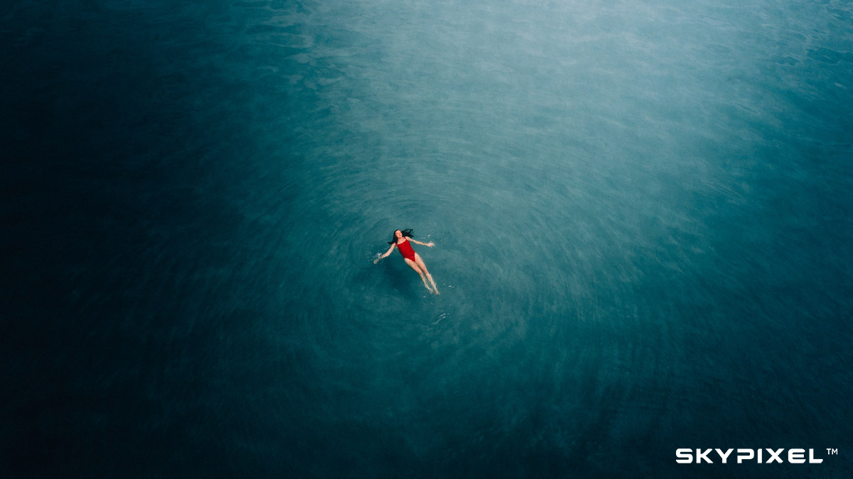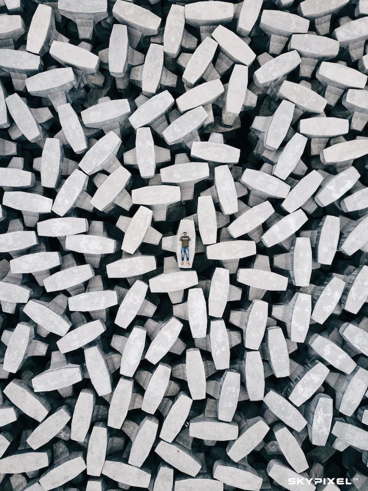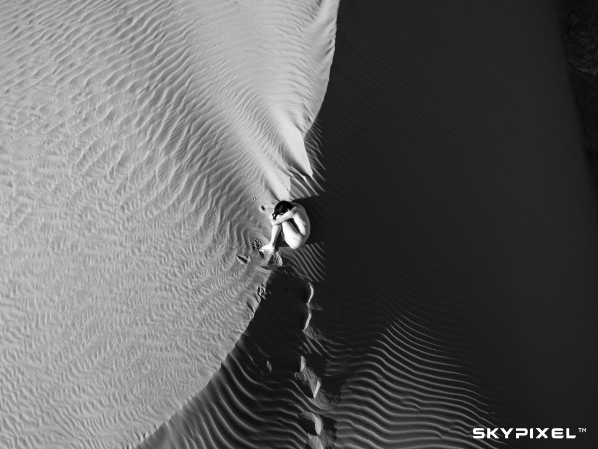 上帝视角的俯拍,是很多人都喜欢用的角度。拍摄之前,我们需要先用飞机在空中寻找到适合风景和构图,然后躺 / 站 / 蹲在预定的构图点里,按下快门就好了。