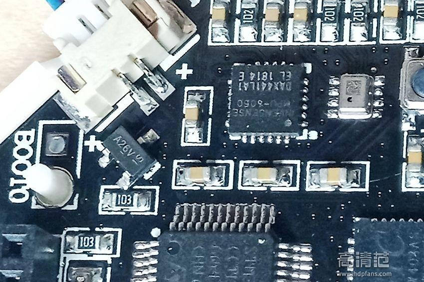 拆下线路板后,就发现连接电机的一个三级管类的贴片元件已经烧毁。从另外一个电机接口的地方可以看到,这是一个MOS管,丝印的型号为A26V。经过查询,这个贴片型号为AO3402,知道了型号,那就简单了。万能的某宝里1块钱20片,加上运费总共5块钱搞定。