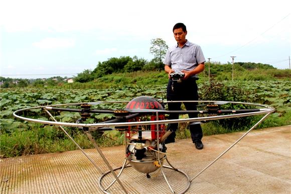 2014年,蔡金云从网上得知上海有厂家开发农用无人机,便专程前往考察后,投入13万元从上海买回一架,用于藕田喷施农药。6000亩藕田在不到一周时间里防治完毕。