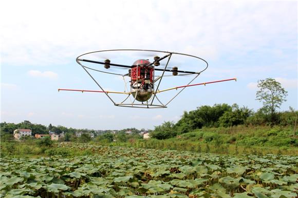 近日,在重庆市铜梁区平滩镇新华村的一片藕田里,蔡金云正在使用农用无人机给莲藕喷施农药。