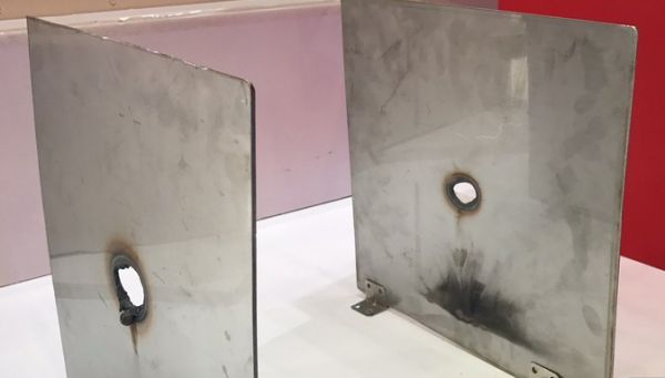 资料图片:防务展上展出的“沉默猎人”激光炮烧穿的钢板。(图片来源于网络)