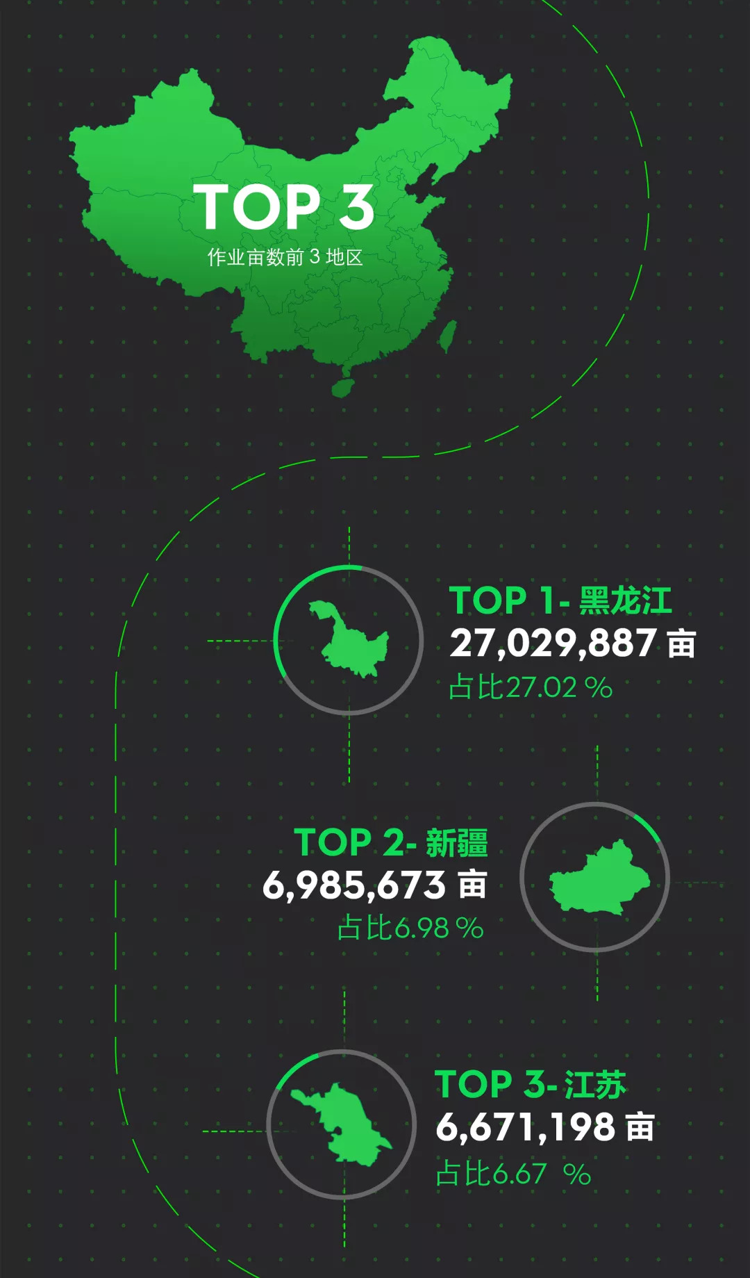 值得注意的是,目前飞防作业普及率最高的省份自治区分别是黑龙江、新疆、江苏三个地区。其中,黑龙江地区作业面积排名第一,达到了 2,702 万亩次,全国占比 27%;新疆地区作业 698 万亩次,排名第二,占比 6.9%;江苏地区作业 667 万亩次,排名第三,占比 6.6%。