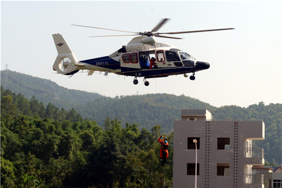 在这次演练中,福州市公安局通过模拟山洪暴发情景,利用警用直升机与无人机的配合,对在撤离过程中不幸跌落山林的一名群众进行搜救。警方率先派出直升机进行先期大范围勘查搜索,为下一步与无人机协同配合开展搜救做好准备。