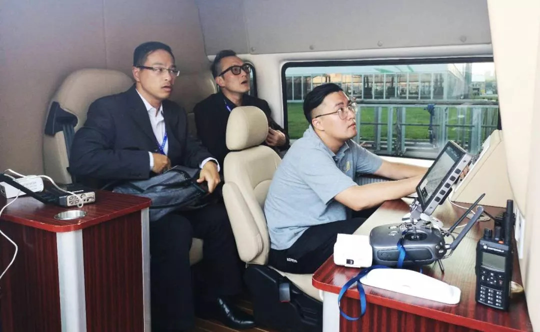 在上海市新国际博览中心广场前,3V复合翼无人机垂直起飞,到达一定高度后即展开对周边区域的巡视。警官们在控制车内通过屏幕可以实时查看机载端视频,可以俯瞰整个区域,同时可以通过吊舱控制终端对地面目标进行变焦查看细节、抓拍等,3V复合翼无人机搭载了30倍变焦的固定翼三轴吊舱,画面清晰稳定,在全面巡查整个区域的同时也不会放过重点目标的细节和追踪等。