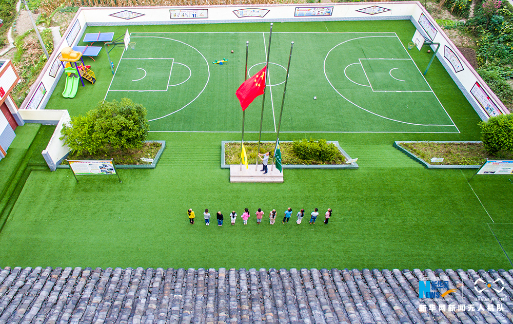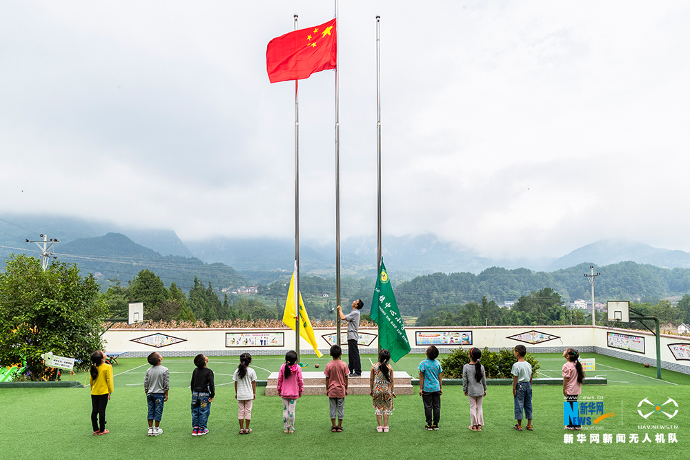 9月6日,重庆市南川区大有镇水源村侨心小学教师江开华和孩子们一起升旗。新华网发(瞿明斌 摄)