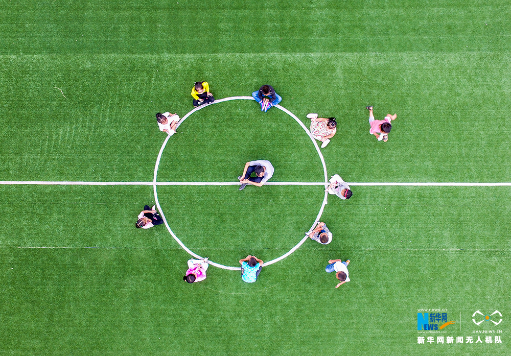 9月6日,重庆市南川区大有镇水源村侨心小学教师江开华在给孩子们一起课间游戏。新华网发(瞿明斌 摄)