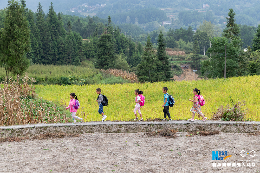 重庆市中小学原定9月1日开学,因高温推迟到9月6日正式开学行课。图为9月6日,重庆市南川区大有镇水源村侨心小学的孩子们行走在上学的路上。新华网发(瞿明斌 摄)
