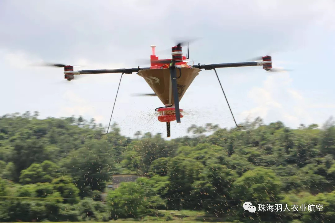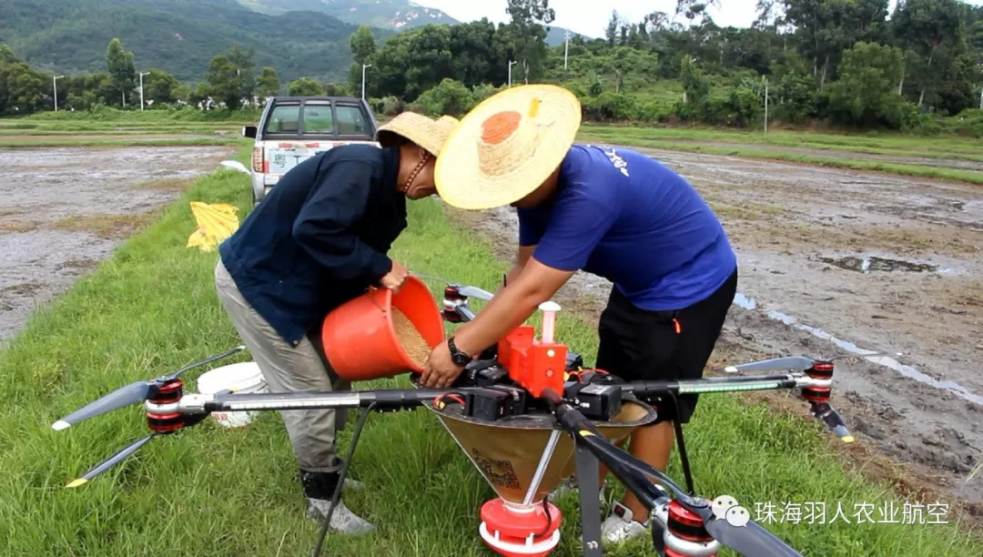 正值水稻播撒大忙之际,为出色完成大耕户植保服务,在气温接近30摄氏度高温的烈日下,羽人植保服务队一直坚守在农田的最前沿,正在往谷上飞播种无人机承载器中倒入泡发好水稻种子,当这些水稻种子填满承载器之后,羽人植保服务队对播种无人机进行调试,准备起飞。