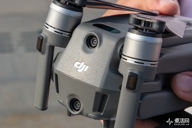 不过相比第一代Mavic Pro,Mavic 2 Pro上几乎是长满了“眼睛”,初代目只有前向的红外感应,到Mavic 2 Pro身上变成了前向双目、底部双目、后方双目、两侧单目和顶部红外的全方位距离感应,11个摄像头之多的感应装置构成了Mavic 2 Pro安全飞行的硬件基石。在机身的底部,Mavic 2 Pro甚至还增加了LED光源照亮机身下方的地面辅助降落,提高暗环境下降落的安全性。底灯通常只会在真的伸手不见五指的晚上启用,一般黄昏傍晚时分飞机降落都不需要补光。