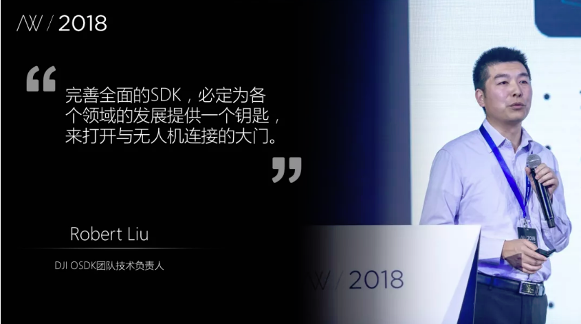 其次是DJI OSDK团队技术负责人Robert Liu先生发言,他认为SDK是无人机行业在其他领域发展的重要枢纽。