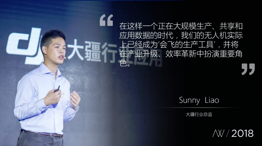 大疆行业应用总监Sunny Liao介绍了大疆在行业应用领域的工作,他认为,行业应用的定制化时代已经到来。
