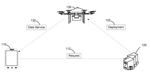 这项被称为“无人航空载具数据服务”(Unmanned Aerial Vehicle Data Services)的专利是一个以无人机为主体的系统,而无人机拥有大容量的数据存储设备和高速数据接口。当用户需要数据增强服务时,就可以通过手机、电脑等设备下订单,之后无人机就会用户所在位置来提供服务。