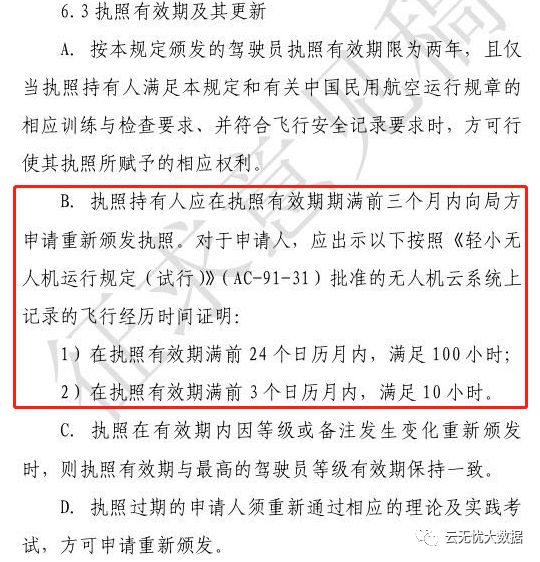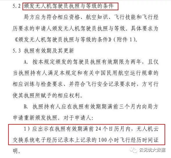 《民用无人机驾驶员管理规定》中明确规定了,在申请执照时,应出示无人机在云系统上记录的飞行经历时间,有效期内前24个月,满足100小时飞行,前3个月满足10小时。