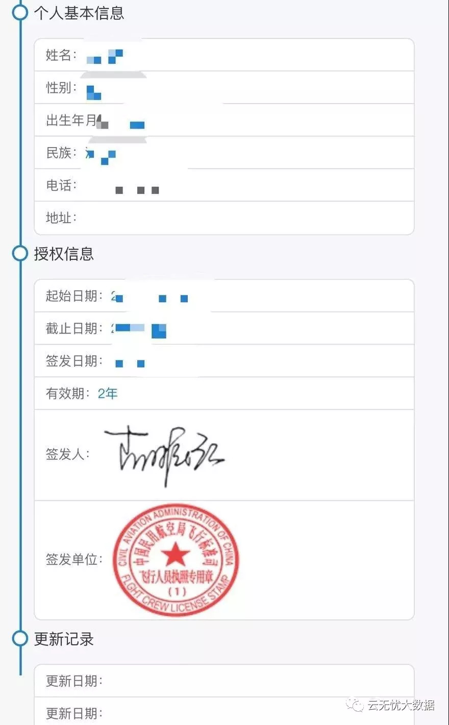 其中执照申请人训练经历数据应在2019年1月1日接入无人机云交换系统(比如无忧云管家系统)。在登录无人机云执照系统后,点击下方“记录”按钮,即可获取执照或等级持有人在无人机云交换系统内积累的飞行经历记录。像无忧云管家系统(已完成民航局数据交换的云系统),一旦关联了云系统,可自动获取飞行时间。