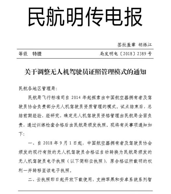 8月31日,民航局发布《关于调整无人机驾驶员证照管理模式的通知》(以下简称“通知”)。