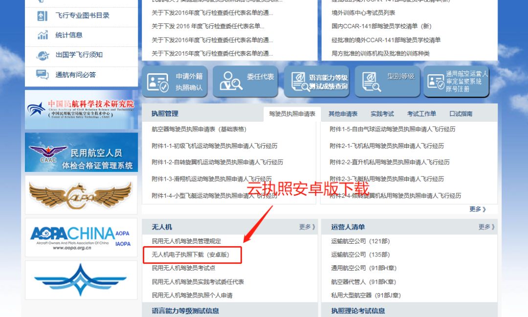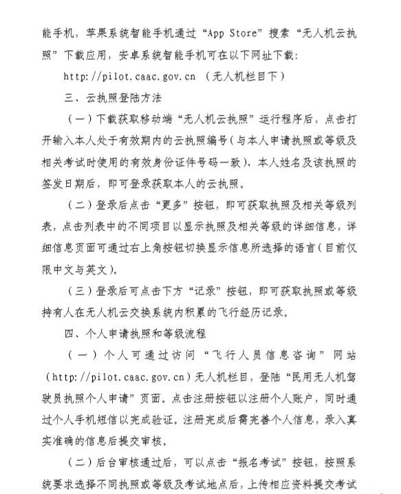 苹果系统智能手机通过“App Store”搜索“无人机云执照”下载应用,安卓系统智能手机可在以下网址下载:http://pilot.caac.gov.cn (无人机栏目下)