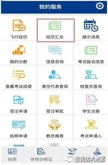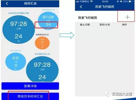 云执照APP中“我的”界面可以看到飞行经历和经历汇总两个功能板块。
