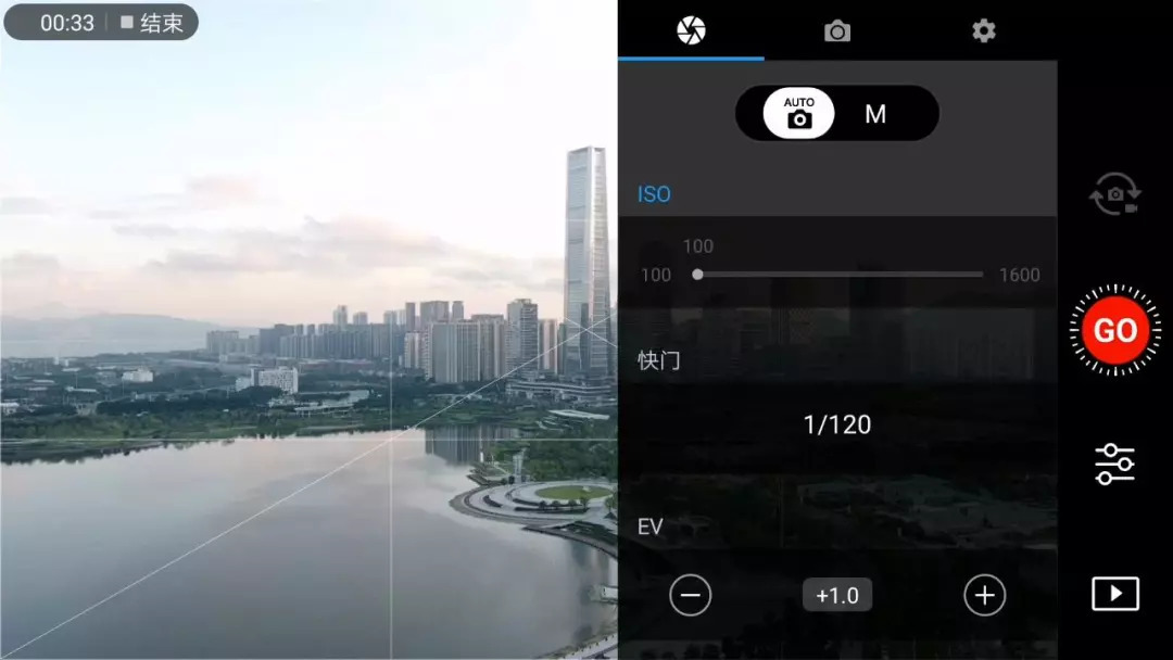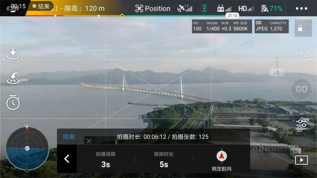 为了给用户保留足够的后期处理空间,拍摄的素材还可以保存 RAW/JPEG 格式的原片。在“环绕延时功能”和“定向延时功能”的使用中,用户需要选择一个“兴趣点”,飞机的稳定云台会自动朝向、并且始终观察它,计算出它的精确 GPS 坐标。为了不改变大家的操作习惯,沿用了最熟悉的画框操作进行“目标选择”。