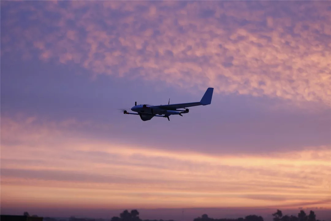 朝霞中的3V复合翼无人机