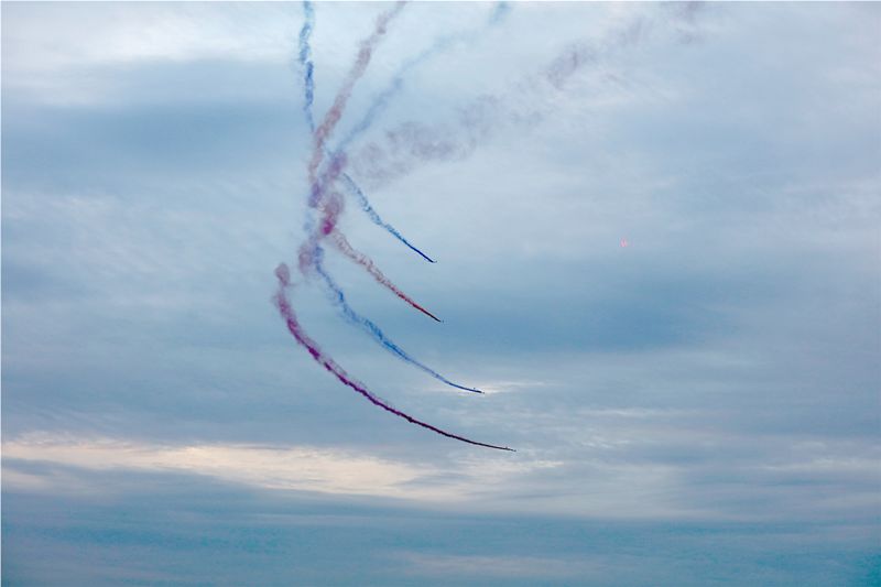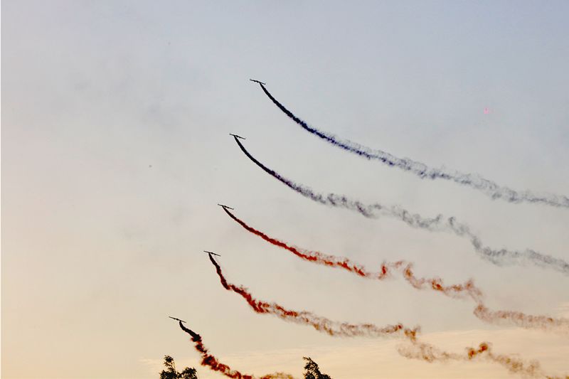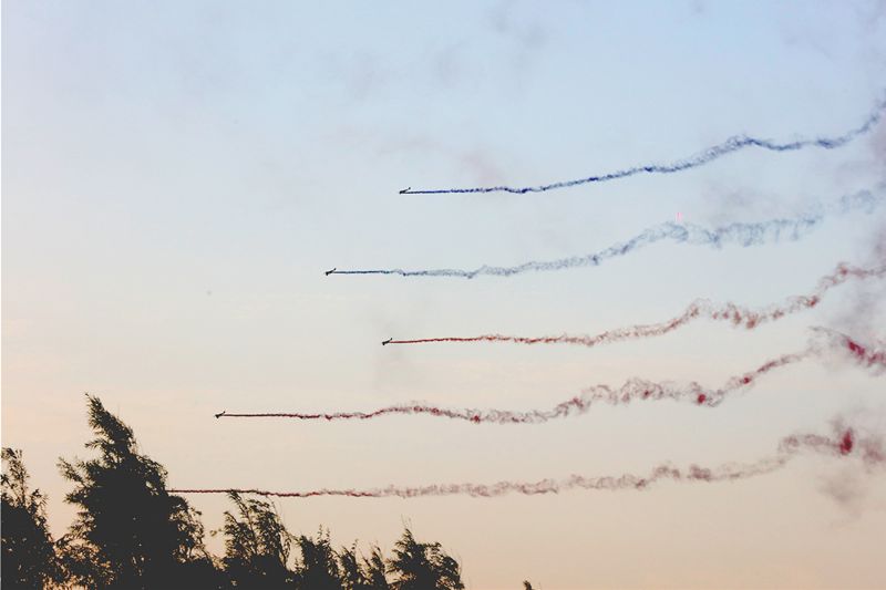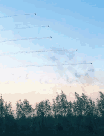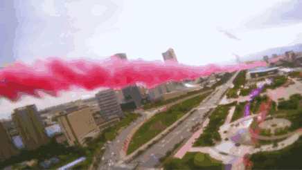 文艺汇演中,零度高巨无人机编队团队带来了全新的多架固定翼无人机编队表演,为这场演出添彩。多架固定翼无人机在广场上空列队高速盘旋,无人机同时挂载彩色烟雾,在歌曲进入到副歌阶段统一进行空中拉烟,五颜六色的彩烟随着整齐飞过的固定翼无人机在空中出现,划出一圈彩虹,给天空留下美丽的色彩。