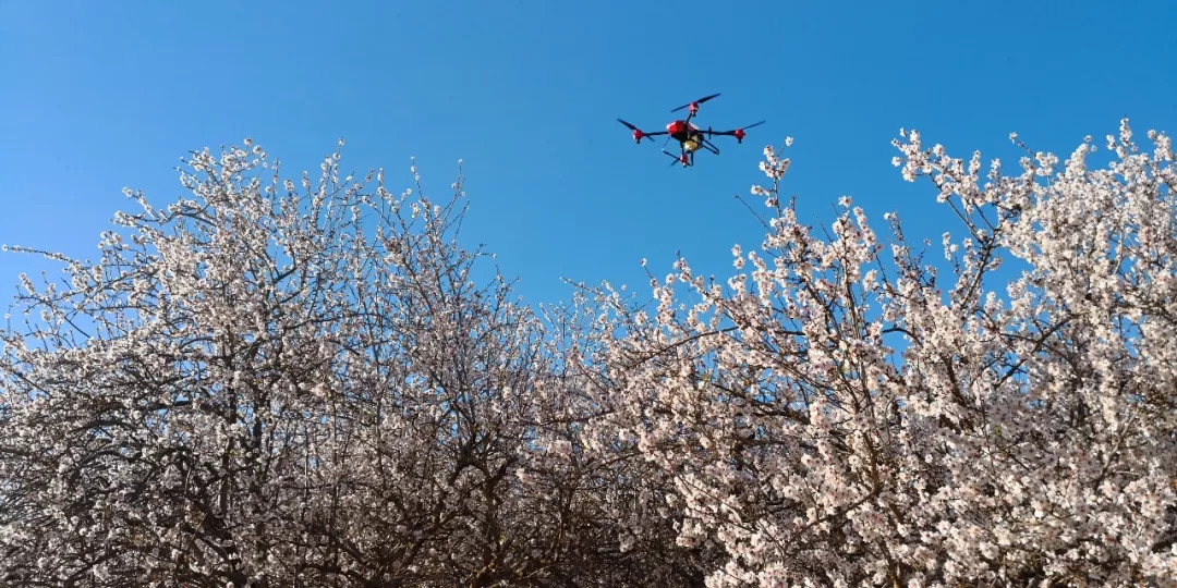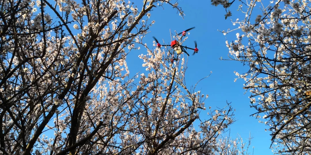 在蜜蜂采集杏仁花粉后,研究小组使用了极飞P20无人机均匀喷洒花粉,为杏仁树进行人工授粉。对比实验结果显示,无人机授粉不仅解决了异花杂交的授粉问题,相比仅通过蜜蜂授粉的果树,产量还提高了15%。