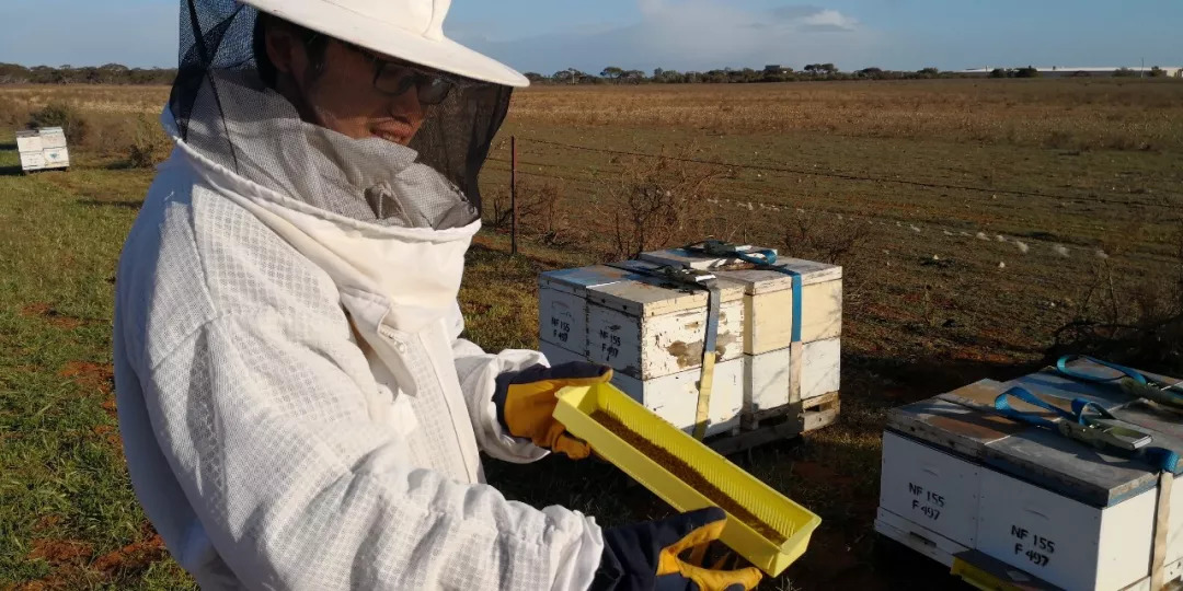 Mickey Wang正在收集蜜蜂所采集的、用于无人机喷洒的杏仁花粉