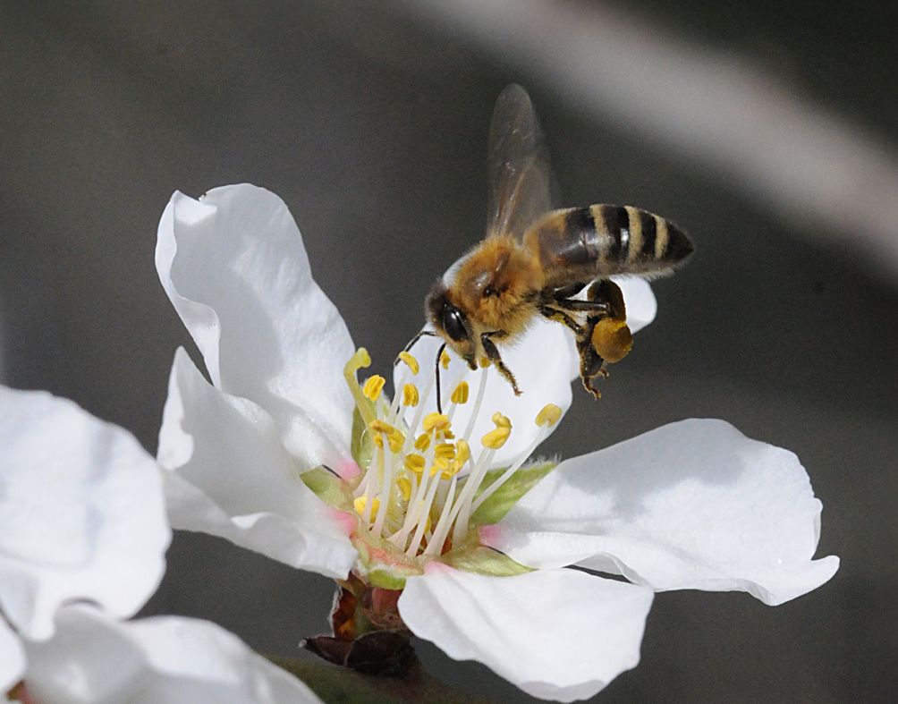 正在采集杏仁花粉的蜜蜂,腿上的“花粉蓝”已经装满了两个大花粉球