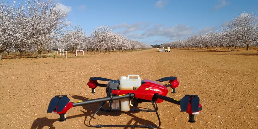 实验成功后,位于维多利亚州的Thurla农场与位于南澳河边地区的Clark Taylor农场相继与极飞科技展开合作,使用极飞P系列植保无人机对3750亩杏仁树进行了规模化授粉,效果超出了农场主的预期。通过无人机授粉与蜜蜂采粉结合,改变传统的杏仁树单一虫媒授粉方式,解决了果农们对蜂群数量不足以及蜜蜂工作效率的担忧,并且提高了果树的产量。